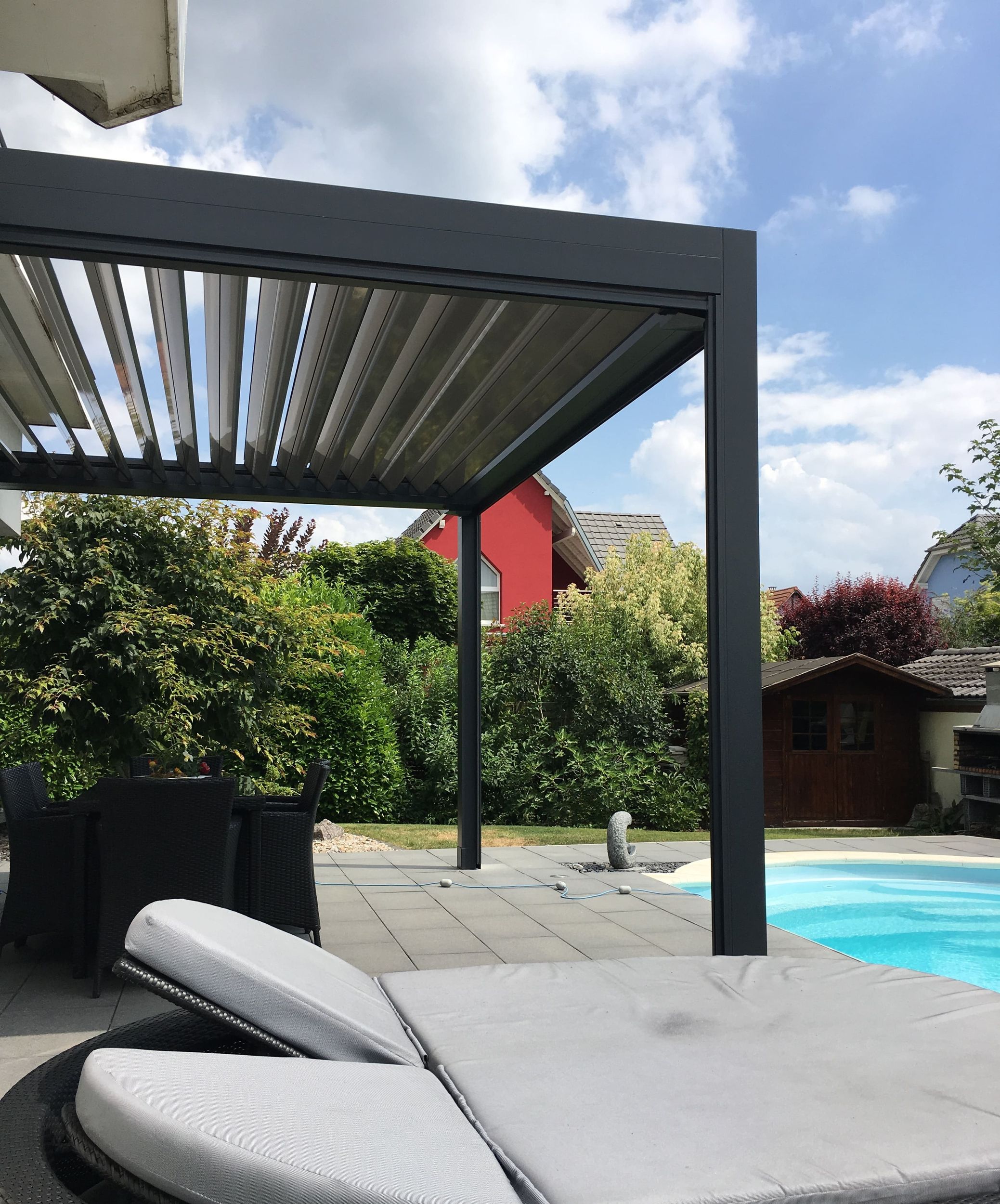 Das Open’R® Lamellendach ist eine innovative, bioklimatische Pergola mit einfahrbaren Lamellen, die Ihnen ermöglicht, Ihren Außenbereich das ganze Jahr über optimal zu nutzen. Dank der doppelten Motorisierung können die Lamellen sowohl gedreht als auch vollständig eingefahren werden, wodurch Sie die Licht- und Luftverhältnisse ganz nach Ihren Wünschen steuern können.