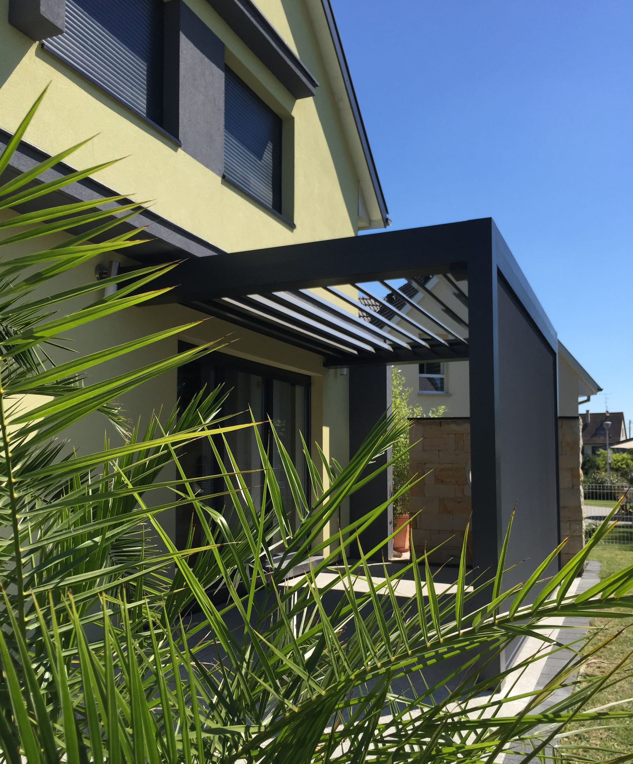 Individuelle Farbgestaltung: Wählen Sie aus drei Standardfarben oder jeder gewünschten RAL-Farbe für Pfosten, Balken und Lamellen.